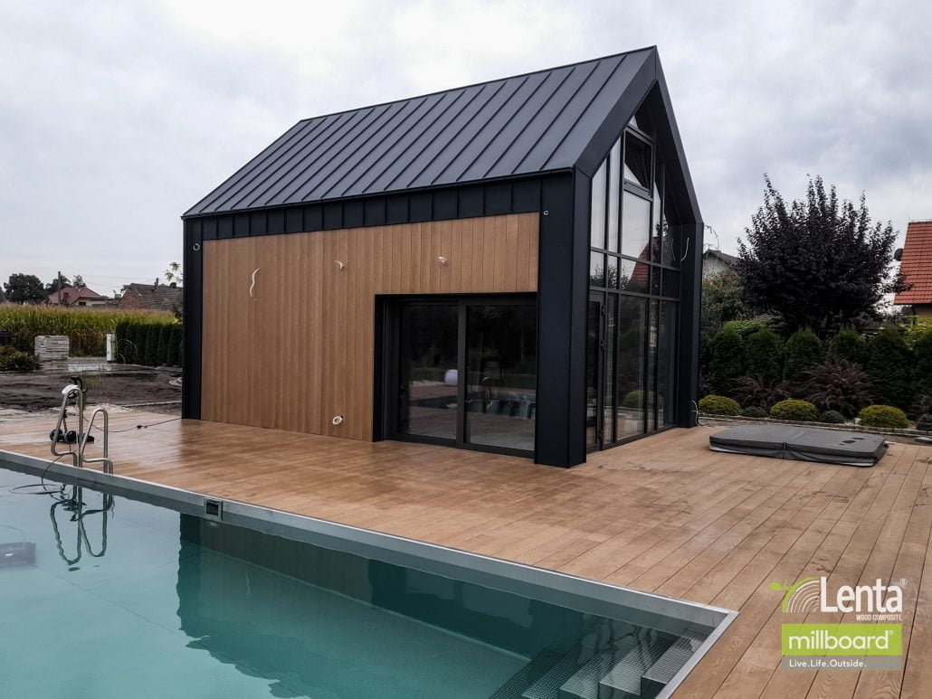 Kompozytowe deski elewacyjne zamontowane na elewacji, przyjmują postać eleganckiego ażurowego panelu. Naturalna estetyka drewna doskonale komponuje się z innymi elementami konstrukcyjnymi, typową stolarką otworową oraz dużymi przeszkleniami. Można powiedzieć, że kompozytowa deska elewacyjna podnosi atrakcyjność elewacji i całego budynku, a co za tym idzie, zwiększa wycenę nieruchomości na rynku. Dodatkową zaletą elewacji kompozytowej jest jej trwałość.