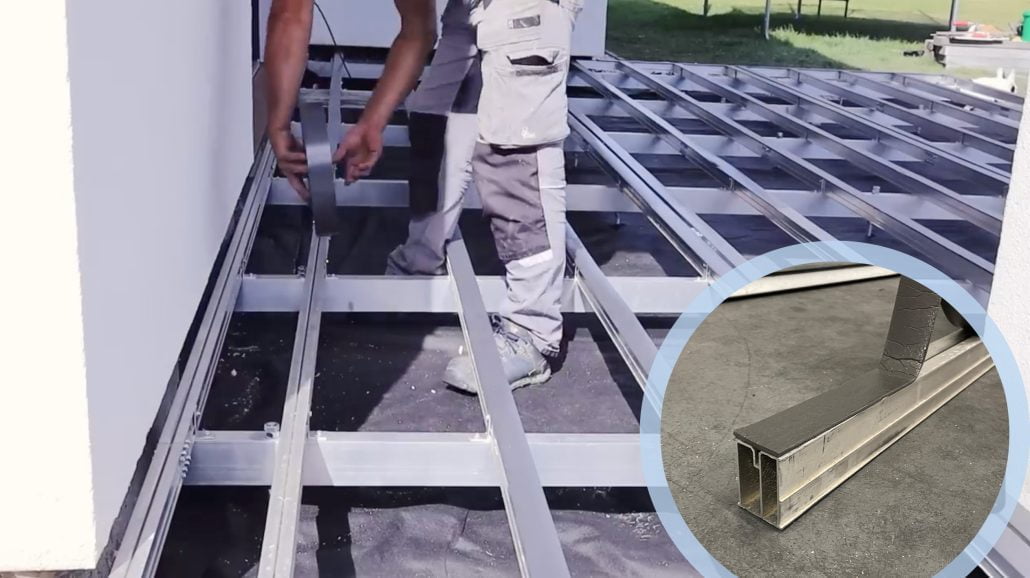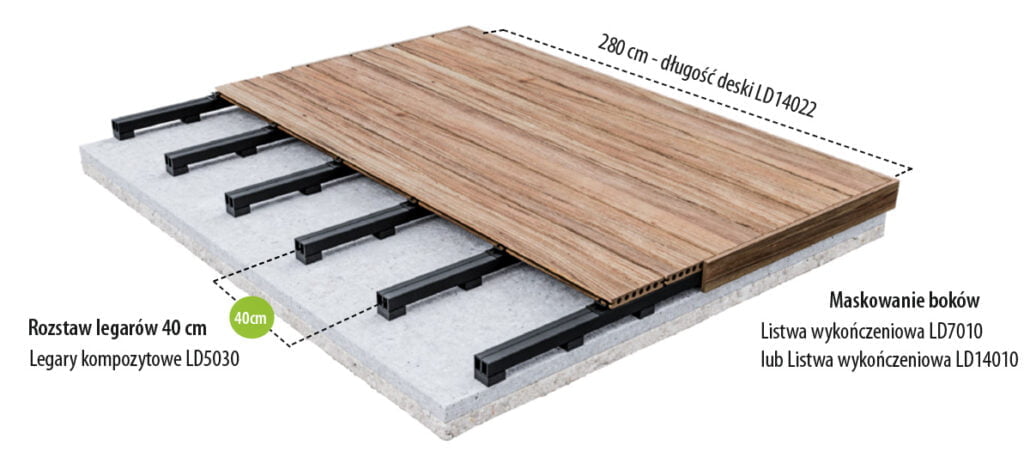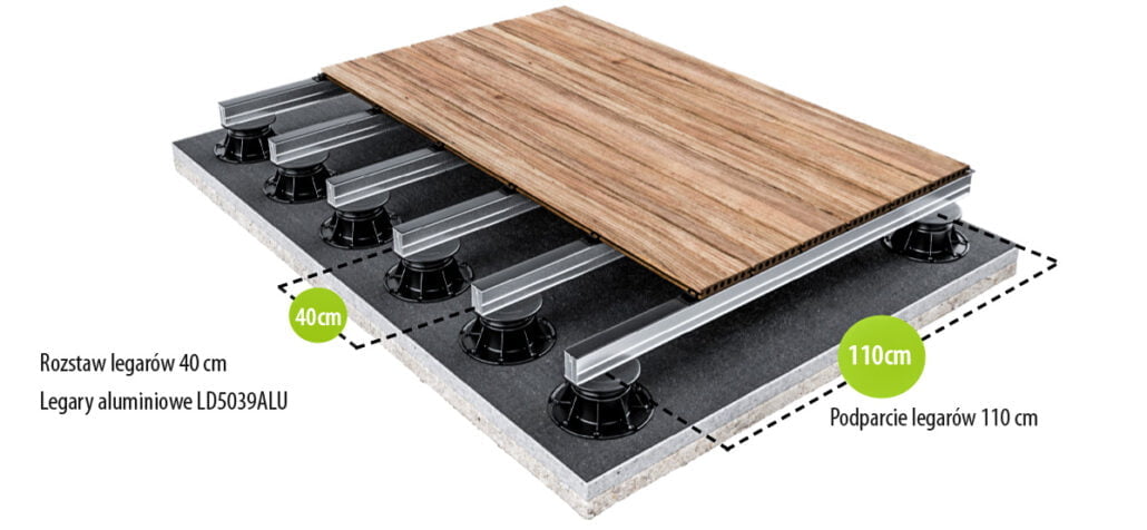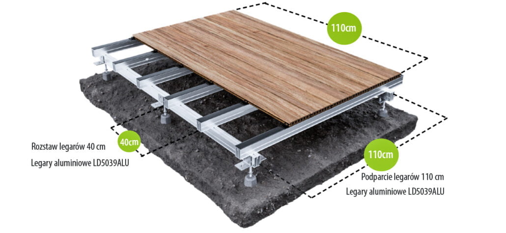 Część fundamentowa konstrukcji służy za podporę dla aluminiowych legarów, do których przymocowywane są klipsy montażowe. Zastosowanie klipsów znacząco ułatwia montaż desek tarasowych kompozytowych, czyniąc cały proces intuicyjnym i szybkim w realizacji. Po wkręceniu klipsów na legarach, pozostaje jedynie wciśnięcie w nie desek.